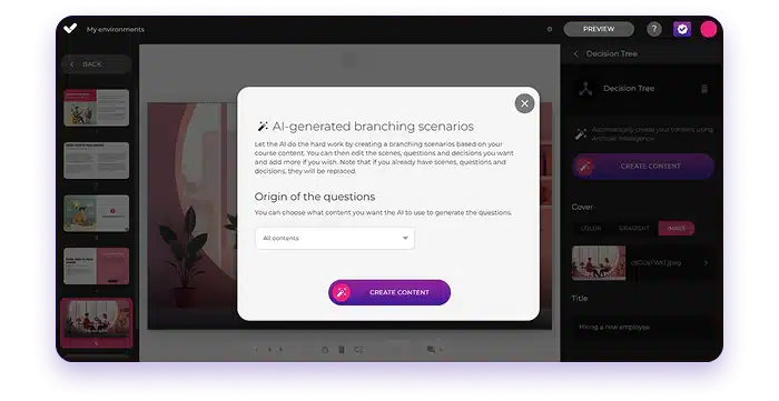 Creating Branching Scenarios for your courses with isEazy Author is quick and easy. You can choose to build it manually from scratch or let artificial intelligence generate it for you from your course content.