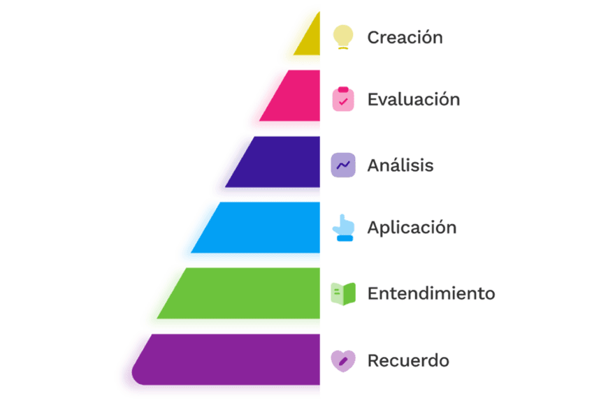 Taxonomía de Bloom: marco de referencia que clasifica los objetivos cognitivos en seis niveles de complejidad ascendente: recordar, comprender, aplicar, analizar, evaluar y crear. Es la herramienta más utilizada para formular objetivos de aprendizaje alineados con el nivel de complejidad real del contenido.